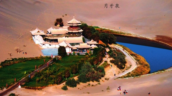 敦煌因莫高窟、鸣沙山与月牙湖而闻名。漫步敦煌市区,很容易发现,这里的建筑大都与莫高窟有关—敦煌市的标志性建筑是一位反弹琵琶的古代美女,路灯是飞天或者大钟造型,连去莫高窟经过的收费站也修得古香古色,取名飞天关。