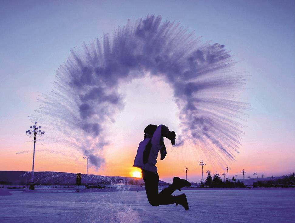 冰天雪地里,“不冻河”如同被施了魔法一样,尽管河道两岸被白雪覆盖,但河水依然潺潺流动,在阳光的照射下,飘浮在河面上的水雾好像五彩云霞。河两边的树枝上缀满了洁白的霜花,烟雾缥缈中,远处的山峦静谧安详,构成了“不冻河”的冬日梦幻世界。