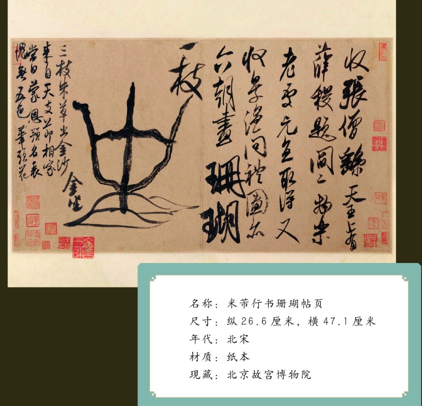 看不到米芾亲笔绘制的山水固然遗憾,但这并不代表今人看不到米芾的绘画作品,北京故宫博物院珍藏的《米芾行书珊瑚帖页》(俗称《珊瑚帖》)便是难得的瑰宝。这件珍贵的传世之作是米芾晚年的代表作,将书法、绘画、诗歌熔于一炉。米芾用寥寥数笔,便将一个用珊瑚制成的笔架形象地呈现在纸张之上,足见其绘画功底之深厚。