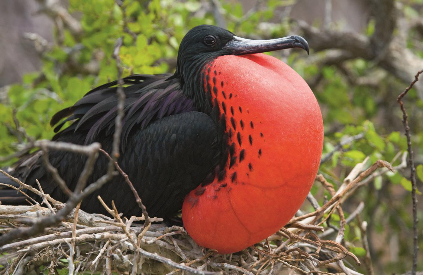 军舰鸟喜欢集群生活,繁殖季节更是如此,因此只有斗争经验丰富的军舰鸟才有机会占据繁殖岛的最佳位置。当雄鸟占位之后,会通过求偶炫耀吸引雌鸟前来交配—它会摇摆身躯、拍打双翅,上下喙不断碰撞并发出“嗒嗒”声,然后极力将暗红色的软喉囊膨胀成鲜红的、硕大的、鼓鼓的帆状,这样能凸显“男子汉气概”,获得雌鸟的青睐。