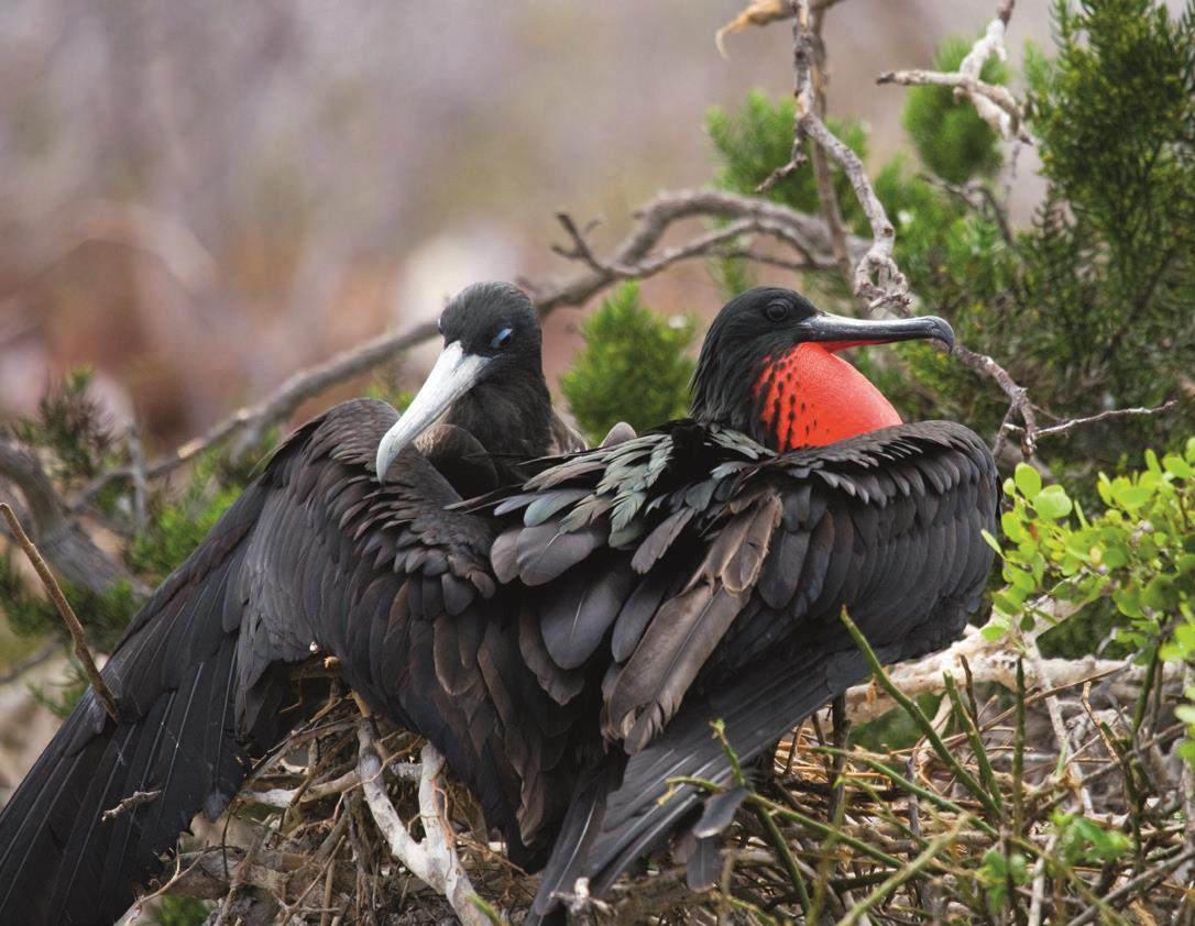 其实,军舰鸟炫耀喉囊、抢占巢位的行为跟鸟类的其他求偶炫耀一样,不仅保证了种群中优良基因的遗传,而且有助于刺激神经的兴奋、激发性激素的分泌,从而提高受精率。这也证明,集鲜红的喉囊、独特的气味和强者风范(对于军舰鸟而言,只有在竞争中获胜的雄鸟才具有善于掠夺食物的优异基因,这与人类奉行的道德准则毫不相干)于一身的雄鸟才能真正获得雌鸟的青睐。