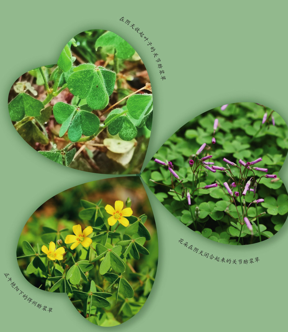 回到植物本身,酢浆草属植物和人一样喜欢睡觉,花朵和叶片每天重复着“昼开夜合”运动,遇到天气不好时还会早早收工歇息。