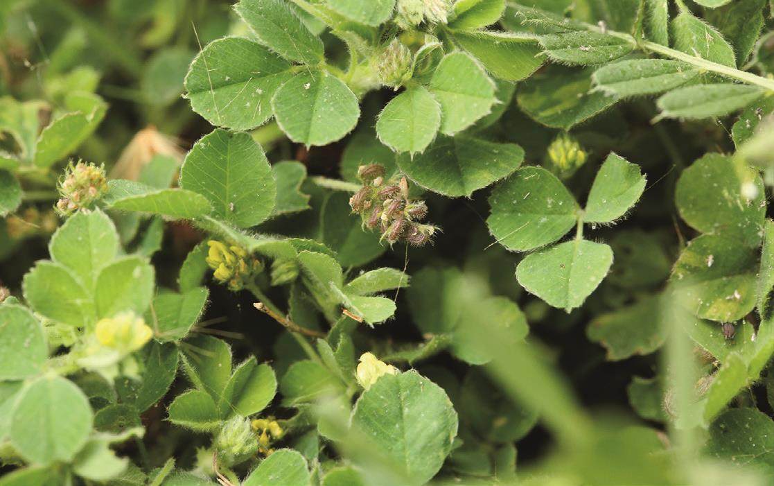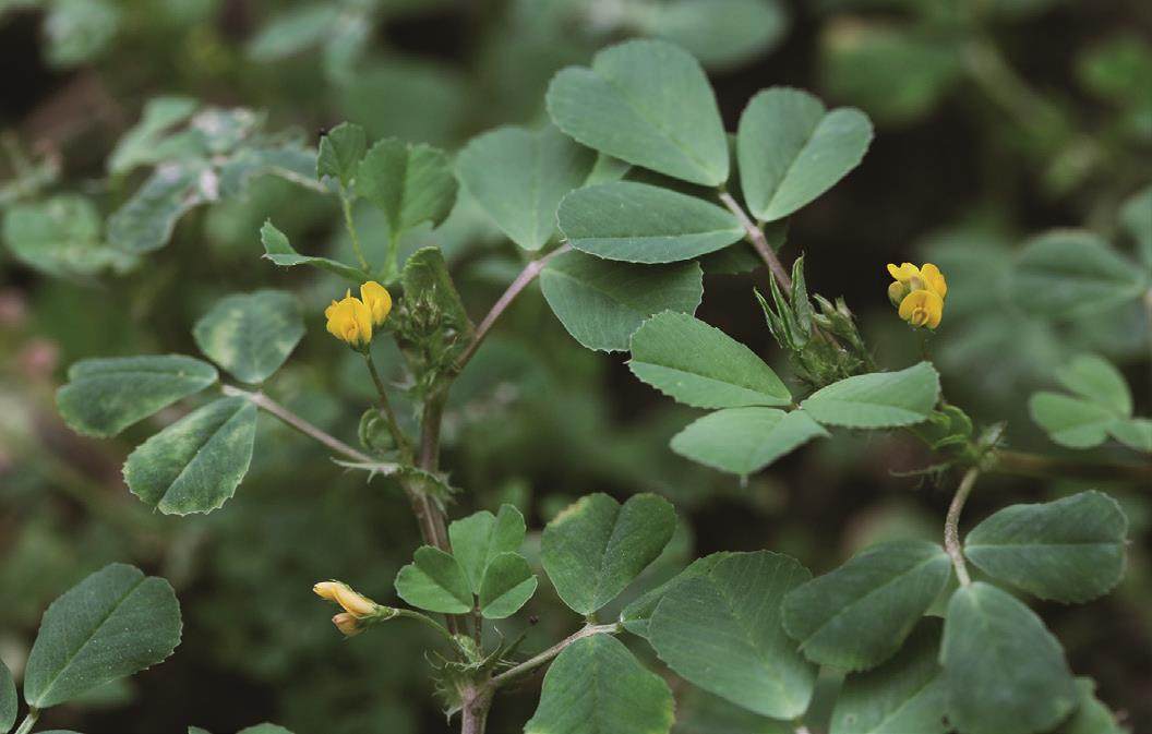 生活中,还有一类三叶草,虽不及车轴草属和酢浆草属的植物出名,但它们的生长环境和形态特征颇为相似,这种植物便是苜蓿属植物。其中常见的有苜蓿(也叫紫苜蓿)(拉丁学名为Medicago sativa L.)、南苜蓿(拉丁学名为Medicago polymorpha L.)和天蓝苜蓿(拉丁学名为Medicago lupulina L.)等。这些苜蓿属植物都有着相似的特征:三枚小叶皆为两侧对称,且上部小叶的叶柄稍长,叶片呈倒卵形,花冠多为黄色或紫色。