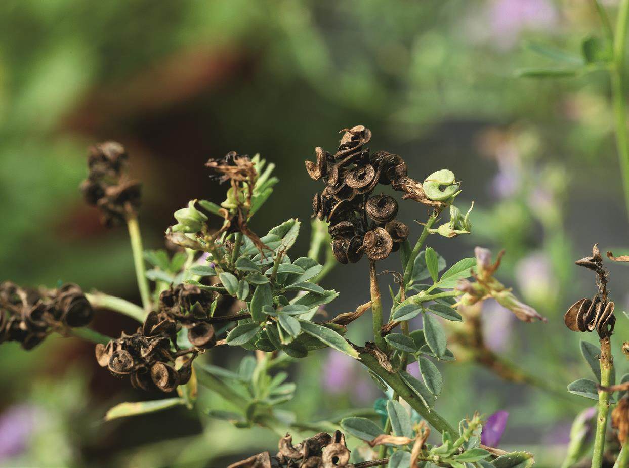 想要将苜蓿属植物从三叶草中区分出来,首先可以看花形、花色,其次便是通过果实区分:苜蓿属植物的果实为螺旋形的荚果,成熟时如同一个个蜗牛,只是有的表面带刺,有的外表光滑。