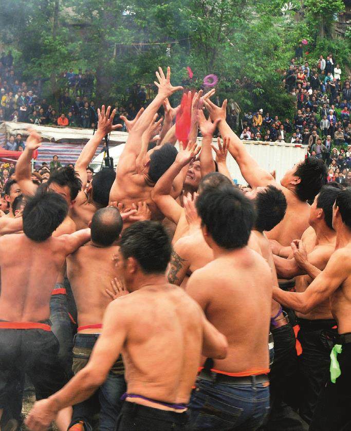 “游炮”结束后,“抢花炮”活动开始。“抢花炮”主要有三炮,抢得头一炮寓意福禄寿喜,抢得第二炮寓意升官发财,抢得第三炮寓意人丁兴旺。当第一炮的花炮头在烟雾里腾空而起,蓄势待发的汉子们双目圆睁,以抢先机。炮头下落瞬间,他们像群鲨围猎,如箭般跃出,一双双粗壮的手抢向那个精巧的“花环”,就像美式橄榄球一样施展挤、扳、钻、藏、护、传、拦等技巧。在这一过程中,选手们不仅展现了他们的默契与合作,更彰显了他们的力量与智慧。