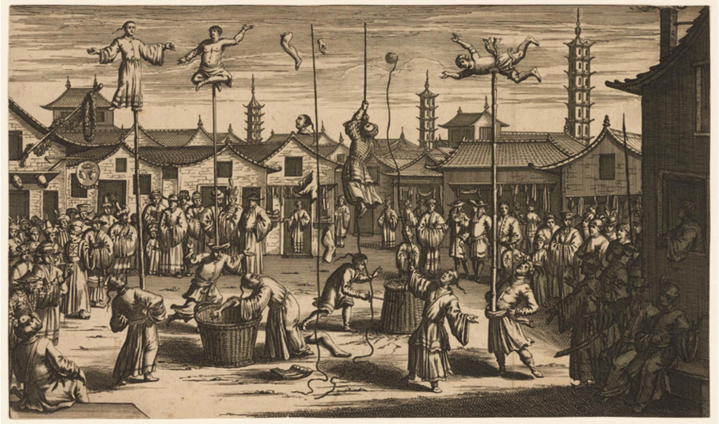 随后,类似的绳技表演不断出现在多个文献或志怪小说中,如明代钱希言的《偷桃小儿》、冯梦龙的《方朔偷桃法》和清代蒲松龄的《聊斋志异·偷桃》等。另据文献记载,1670年,荷兰旅行家爱德华·梅尔顿曾在印度尼西亚的巴达维亚(今天的雅加达)看到过当地华人的绳技表演并将其画了出来。在画作中,一众华人杂技演员或魔术师正在街头表演,其中一位正沿着悬在空中的绳子向上爬。