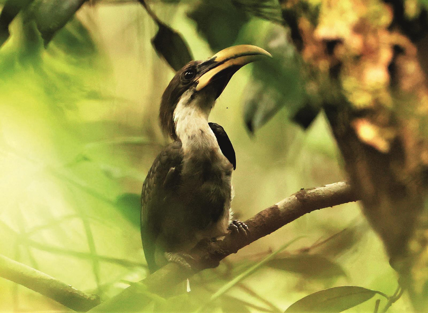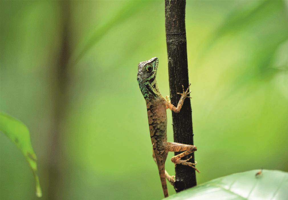 走进雨林深处,一两只灰犀鸟飞来飞去。由于有太多树木遮挡,始终拍不清楚。黑头咬鹃也藏在最隐蔽的密林中,好在总算留下了“记录版”。浓密的叶子中,我差点把斯里兰卡卷尾当成乌鹃。在雨林里,我们还遇到了精致可爱的卡洛特蜥蜴,这个体表绿色与橙色杂糅的小精灵安静又温和。