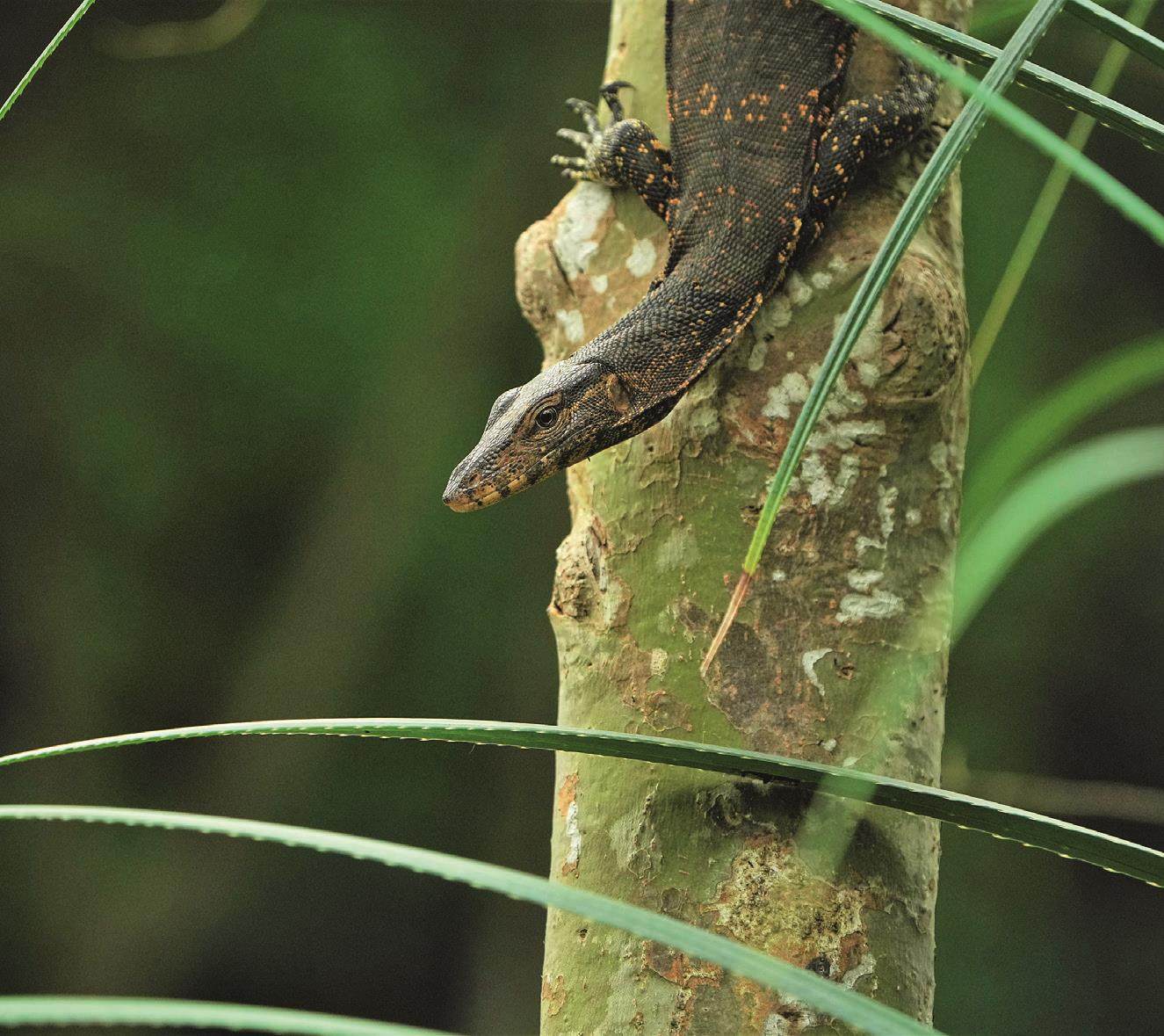 走进带隐蔽网的门廊,正式走进塔拉瓦格霍达生物多样性研究园。此时,园内几乎没有游客,只有我们这些早到的观鸟者。红背三趾啄木鸟首先和我们打招呼,这可是当地特有种。湿地里的庞然大物圆鼻蜥蜴也登场亮相,它口中吐出长长的信子,貌似很冷血,其实这是假象,圆鼻蜥蜴的脾气并不像看起来那么可怖。