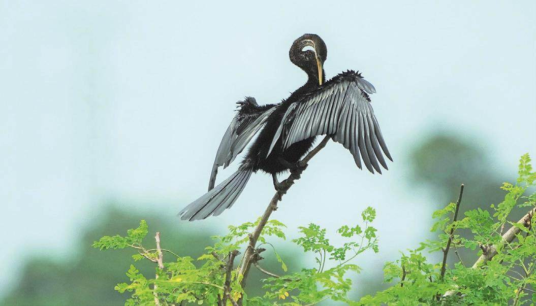 走在湿地的大道上,远远看到被野狗和人力摩托车夹击的野生蓝孔雀在慌乱中跳入灌木丛。湖区,栗鸢和白腹海雕如同风筝般在头顶展翅翱翔;黑颈鸬鹚与黑腹蛇鹈仿佛是盛开在树上的黑色花朵,密密麻麻。斑嘴鹈鹕以大欺小把钳嘴鹳轰下枯枝,红背三趾啄木鸟多次出现在树干上,斯里兰卡绿鸠停在枯枝上休息。当印度鸬鹚的身影划过水面之后,天色暗得已经不适合再拍摄,我们只得返回酒店。