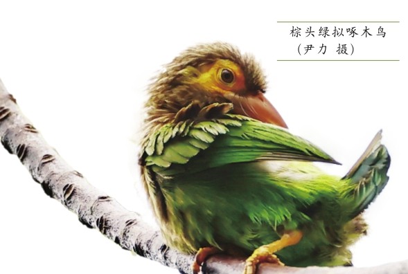 村中有一棵高大的番石榴树,结出的果实像梨那么大,挂满高枝,白喉啄花鸟、方尾黑鹎都在树上大快朵颐。熟透的果实掉在地上,满地都是白茫茫的。对面一棵光秃秃的棕榈树上竟然站着一只黄额拟啄木鸟,它身被绿色羽毛,眼眶周围是天蓝色,头上仿佛顶着一块黄色的奶油,这只鸟左顾右盼地守护着自己找到的巢穴,大家赶紧跑过去一通狂拍,终于满足了“数毛版”的需求。