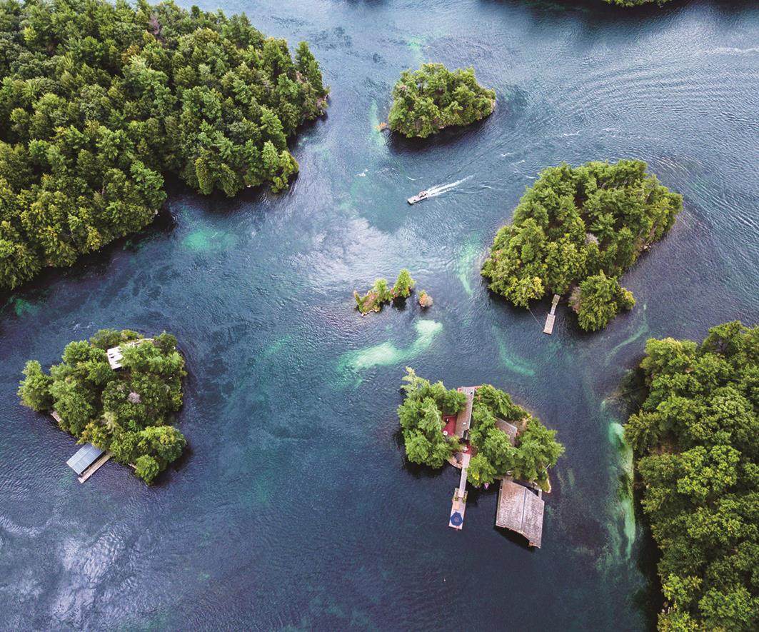 在北美洲五大湖区,安大略湖与圣劳伦斯河交界处的金斯顿,也有一处奇特的千岛湖。该处湖面上散落着大小不等的1865座岛屿。这里之所以有如此众多的岛屿,是因为当地人认为只要露出水面的土地上生长着两棵树,就可以称之为岛。这里恰好是加拿大和美国的国境分界线,其中,三分之二的岛屿属于加拿大,三分之一的岛屿属于美国。