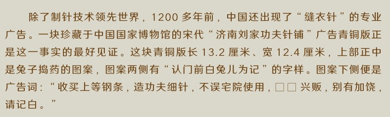 关于中国的制针技术,《天工开物—给孩子的中国古代科技百科全书》中有完整且生动的描述:先将铁片锤成细长的铁条,然后在一根铁尺上钻出小孔,将铁条从小孔中抽过,使其变成铁线;将铁线一截一截剪断做成针坯,然后把针坯的一端锤尖,而另一端锤扁,用锥子钻出穿线的针眼,再把针的周围锤打平整;之后,还要将针放入锅里,用慢火炒;炒过之后,倒入泥粉、松木炭和豆豉,将针掩盖,再用火蒸;留两三根针插在外面,作为观察火候之用;当外面的针能用手捻成粉末时,就表明可以开封了;最后,经过凉水冷却,针就做好了。