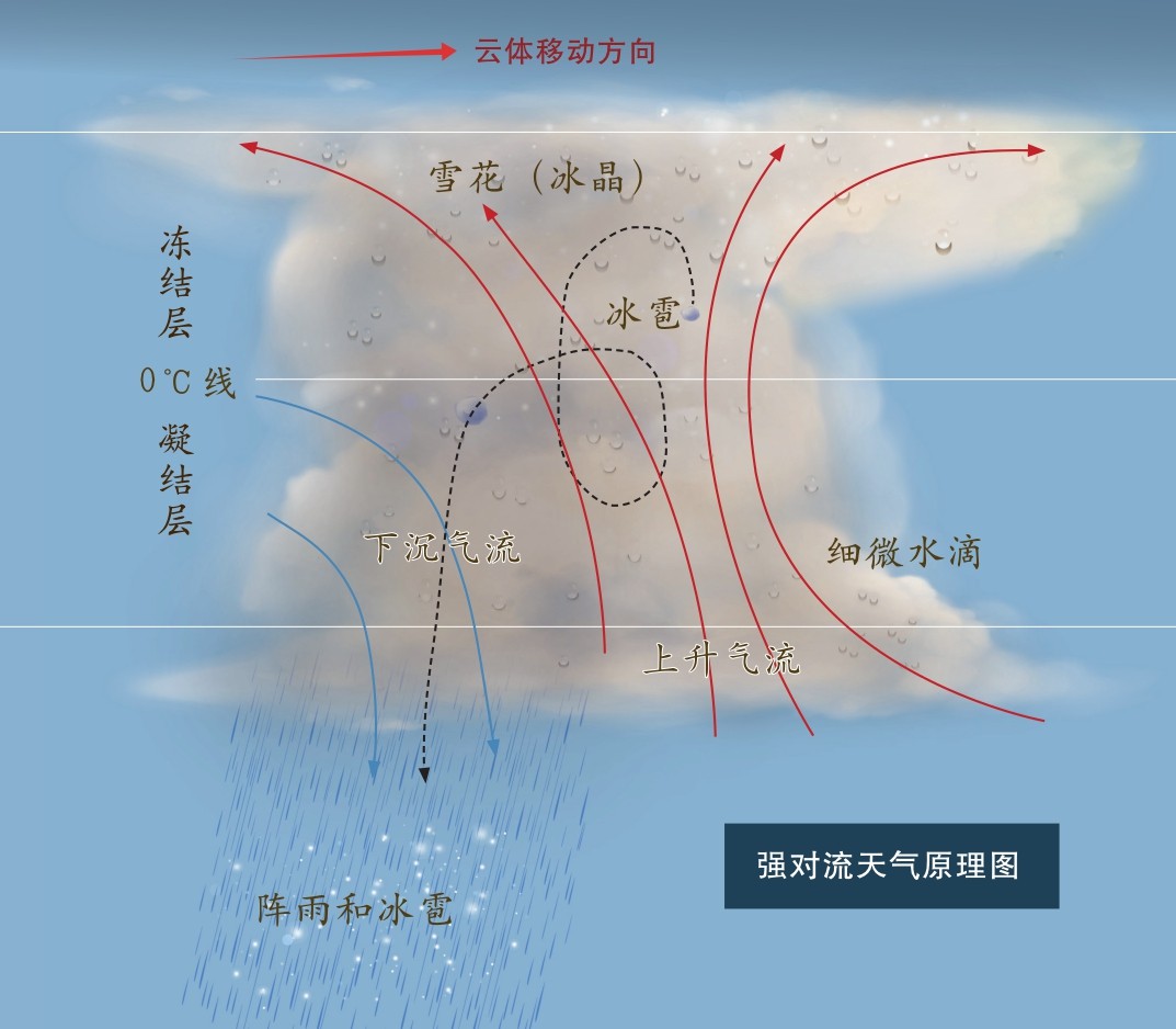 下击暴流发生时,高低空冷暖差异往往非常巨大。当有上升气流支撑时,高空的冷空气被托举,随着雷暴云的移动,某地上空的上升气流会迅速减弱甚至消失,重量较重的冷空气失去了上升气流的支撑,加上雨水的拖拽,便会下沉,从而产生下沉气流。由于高低空冷暖差异巨大,下沉气流越往下沉,周围环境中的气温越高,下沉气流往下冲的动力就越足,最后冲向地面,向四周扩散。