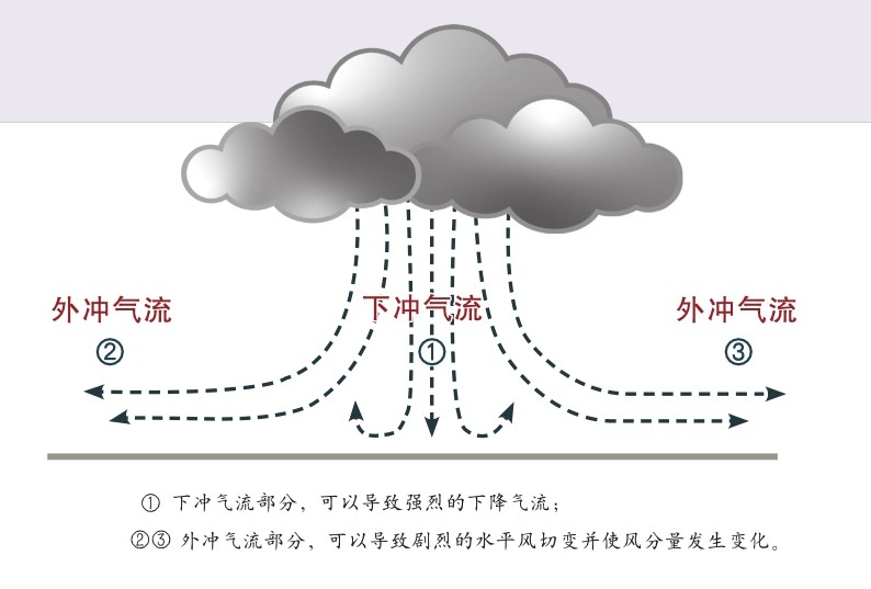 下击暴流是地面上水平风速大于17.9米每秒、中空气流向下、地面气流为辐散或直线型的灾害性大风。通俗地讲,就是在雨的拖拽下,高空中的冷空气倾盆而泄,重重地砸在地面上,然后向四周扩散所形成的大风。