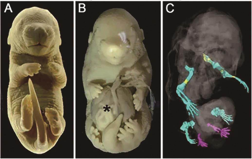 葡萄牙科学家利用基因工程技术培育出了有6条腿的小鼠胚胎。医学影像显示,这个小鼠胚胎在本该生长外生殖器的部位,长出了两条额外的后肢。这项研究揭示了DNA(脱氧核糖核酸)三维结构的改变会如何影响胚胎发育。现代四肢动物的后肢和外生殖器被认为源自其祖先的同一个原基,该原基在进化过程中发展出多样化结构,以适应物种所占生态位中的有效运动和繁殖。这项研究表明,尽管小鼠是由其祖先经过漫长的时间进化而来的,但它们的外生殖器原基仍保留了发育成后肢的能力。