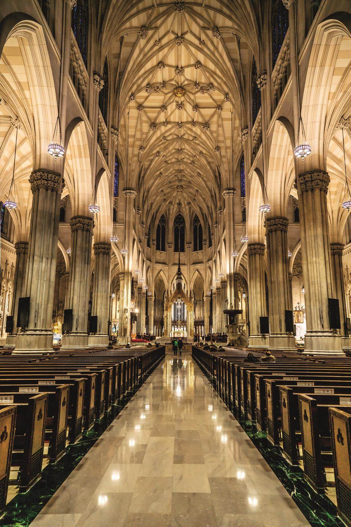 巴黎圣母院内的大教堂享誉世界建筑和艺术史,是一座典型的“哥特”式建筑。那么,什么是哥特式建筑呢?简单来说,高而且尖,屋顶、塔楼、扶壁和门窗等以尖塔或尖券来结束,是哥特式建筑的最大特点。这样的建筑风格在巴黎圣母院上的直观体现便是拱顶较轻,不像老式拱顶那样低矮沉重,同时窗子敞亮,室内光线充足。从外观上看,给人一种热烈向上的感觉,从内部观赏又简洁明快。巴黎圣母院正门内是长方形大教堂,教堂内正殿高于两旁的附属结构,一座尖塔兀立屋脊,高耸入云。塔高约90米,塔上还有一梭形尖顶,顶端是细长的十字架,远望似与天际相连。堂内大厅长约130米,宽约50米,可放千张木制长椅,容纳近9000人。