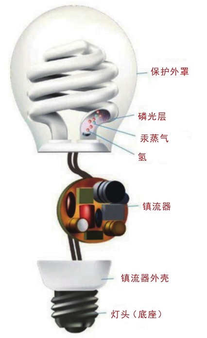 我们通常所说的“节能灯”,其实它的学名叫作“稀土三基色紧凑型荧光灯”。所谓“稀土三基色”,是说节能灯所使用的红、绿、蓝三种荧光粉,都是以稀土元素作为主要成分。所谓“紧凑型”,是指把荧光灯与镇流器(安定器)组合成一个整体。