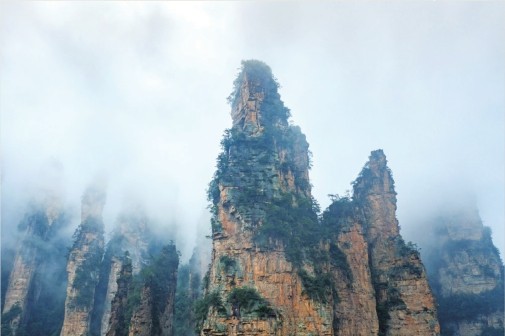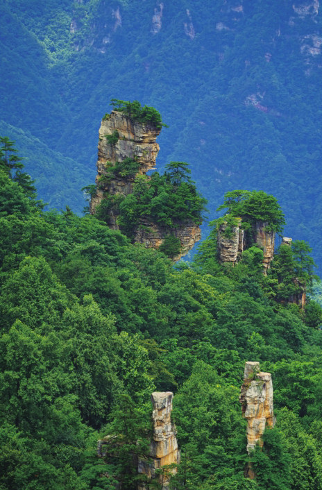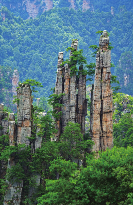 当我们仔细观察天子山的山峰时会发现,它们均由砂岩组成,岩层产状近乎水平,而垂向的节理将它们切割得七零八落,形成独特的形状,地质学家称之为砂岩峰林,并认为这些山峰正处于峰林演化史的壮年期,其规模之大、形态之美世所罕见,所以称赞这里是“峰林之王”。