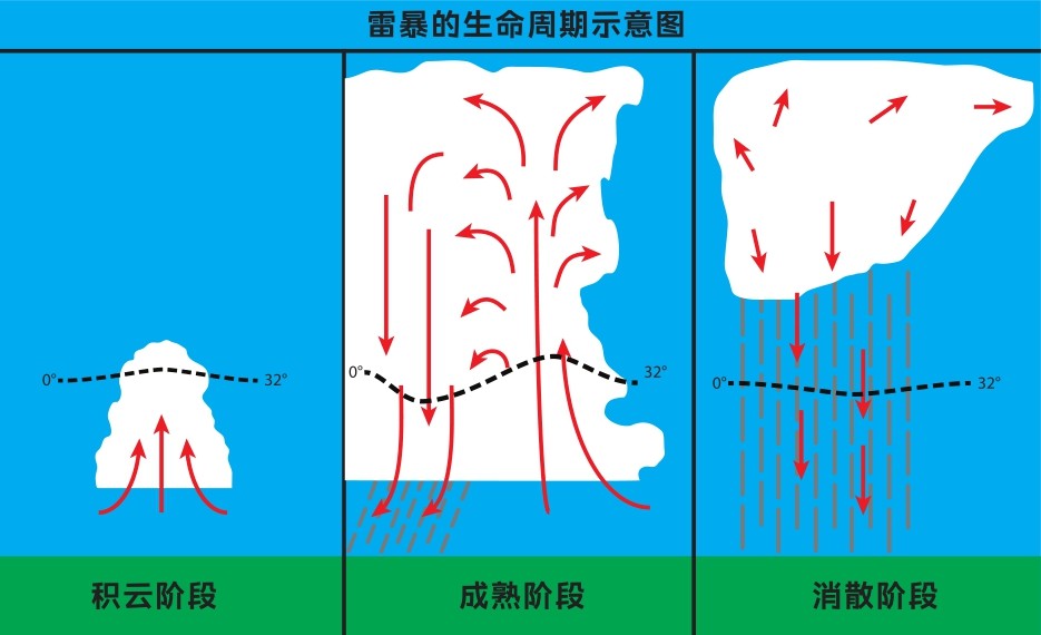 作为一种小尺度天气系统,雷暴云的持续时间只有几十分钟,且必须在不稳定的大气层结、充沛的水汽条件和足够的冲击力下才能形成。其发展过程可以分为积云阶段、成熟阶段和消散阶段三个阶段。在积云阶段,雷暴单体内主要为比较规则的上升气流,此时一般不会产生雷暴。在成熟阶段,云内除了有规则的上升气流外,同时有系统性的下沉气流,并伴有雷电和降水。一阵电闪雷鸣与狂风暴雨之后,雷暴云进入消散阶段。此时,云层被有规则的下沉气流所控制,云体逐渐崩溃。