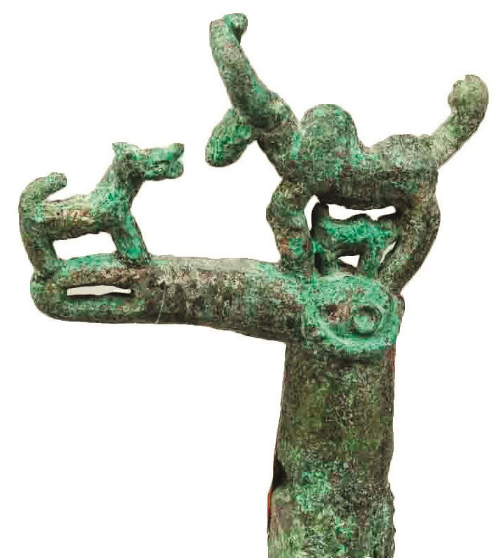 上述观点看似很有道理,其实都有点牵强附会。鸠杖早在汉代之前就已经出现,考古工作者在距今3500多年的青海省湟源县卡约文化遗址中发现了3根青铜鸠杖。据推测,这应该是当时部落首领权力的象征,源于早期的鸟图腾崇拜。我国古代先民的崇鸟习俗由来已久,神话传说和出土遗物都能佐证。例如,《诗经》中“天生玄鸟,降而生商”讲述的就是关于鸟图腾崇拜的传说。此外,在浙江良渚遗址的一件高等级玉礼器上有立鸟站在小圆柱上的刻画符号,这是鸟图腾崇拜最直接的证据。鸠杖是在鸟图腾崇拜的基础上产生的一种权杖,只是后来随着人类社会的发展,鸠杖的权杖功能逐渐淡化,而帮助老人行走的功能逐渐凸显,尊老敬老的象征意义也逐渐衍生出来。
