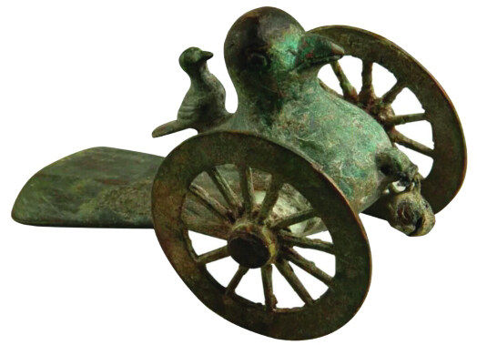 河南洛阳博物馆珍藏的三轮铜鸠车就是一件精美的西晋鸠车。鸠车整体铸成昂首挺胸的鸠鸟形象,尾羽长而扁平;翅膀两侧有两个大轮子,尾羽下侧有一个小轮子;鸠鸟前胸处有一个可穿线绳的小孔,拉着线绳就能带动鸠车前进。鸠车造型灵动,栩栩如生。如果用力拉绳向前拖拽,鸠车尾部就会翘起来,似欲展翅飞翔;若拉绳缓慢前行,鸠车则尾部拖地,如同鸠鸟行走时的姿态。