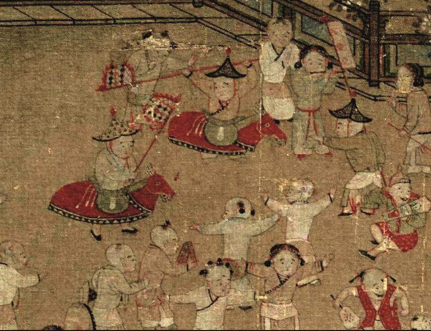 得益于“青梅竹马”一词,大家对古时与鸠车齐名的竹马比较熟悉。所谓竹马,就是儿童用以当马骑的竹竿,最简单的竹马就是一根竹竿。制作精细的竹马,可以用木头刻制马头套在竹竿上;或用竹篾扎制,外面糊纸,彩绘后上涂桐油,在“马脖”处系铃铛,并在白布围裙上画奔驰状的马腿。除此之外,古人还用四腿八扎的长板凳为竹马进行游戏。