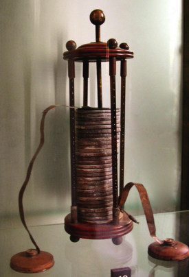 1800年3月20日,伏打宣布了一个重要的科学发现,这就是著名的“伏打电池”。他用银片和锌片两种不同的金属做电极,用盐水或其他导电溶液作为电解液,从而构成了电流回路。在伏打之前,人们只能应用摩擦发电机来发电,并将电荷存放在莱顿瓶中。这种发电的方法十分麻烦,得到的电量也受到很大限制。伏打电池克服了这些缺点,使得电荷的获取变得非常方便。