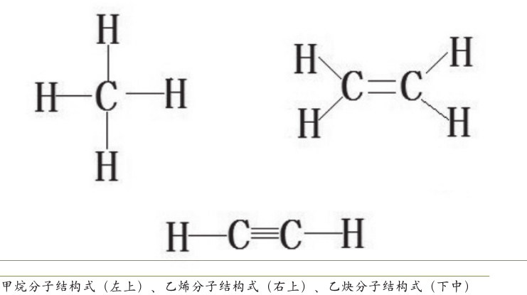 根据成键两原子间共用电子的对数,可以将共价键分为单键、双键和三键。两原子间共用一对电子的共价键称为单键,如C—C、C—O、C—H;两原子间共用两对电子的共价键称为双键,如C=C、C=O;两原子间共用三对电子的共价键称为三键,如C≡C、C≡N。以甲烷、乙烯、乙烷为例:天然气的主要成分是甲烷(分子式CH4),甲烷分子的构型为四面体型,分子中1个碳原子与4个氢原子形成4个C—H单键;乙烯(分子式C2H4)分子的构型为平面型,分子中存在1个C=C双键,2个碳原子和4个氢原子共平面;乙炔(分子式C2H2)分子的构型为直线型,分子中存在1个C≡C三键,2个碳原子和2个氢原子处于同一条直线上。