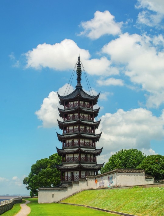 在阳光照耀下、江水映衬中,盐官古城格外夺目,城外的盐官海塘固若金汤,城内的海神庙则璀璨非凡。
