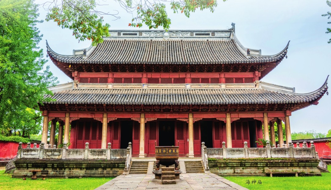 盐官古城,历为海宁盐官地域郡﹑州﹑县治地,始建于唐永徽六年(655年)。元泰定四年(1327年),因“海水溢冲捍海塘,坏州郭四里”,城址荡然无存。直到元至正十九年(1359年)才得以重建,“江浙行省命左右司都事陈元礼筑城……南临海”。盐官城的规模虽不大,却很守“规矩”,其城邑格局深受《周礼·考工记》中匠人营国的影响,城市轮廓方正,形状规则。历史上,盐官的城邑共有五座城门和三座水门。五座城门分别是东边的宣德门、春熙门,西边的安戌门,北边的拱辰门和南边的镇海门。三座水门则是宣德水门、安戌水门和拱辰水门。如今五大城门里只保留下春熙门。春熙门旁,有一条接近600米的老街临河而立,老街上明清风格的建筑鳞次栉比。其中,位于春熙门内原大东门直街的海神庙格外引人注目,就连门口的两座汉白玉石狮都显得尤为神气。