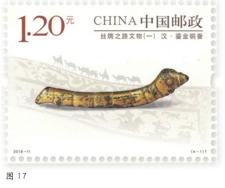 近年来,中国邮政相继发行了多套表现“一带一路”题材的邮票。如2012年8月1日发行的《丝绸之路》特种邮票一套4枚(图13),分别从千年帝京、大漠雄关、神秘故国、西域胜境等方面,表现了古代丝绸之路的漫漫风沙与悠悠驼铃。2016年9月10日发行的《海上丝绸之路》特种邮票一套6枚(图14),分别从政策沟通、设施联通、贸易畅通、资金融通、民心相通、海上交通等方面展现了对21世纪海上丝绸之路的伟大构想。为配合2017年5月14日至15日在北京举办的“一带一路”国际合作高峰论坛,中国邮政发行了《“一带一路”国际合作高峰论坛》纪念邮票一套(图15)。2023年是“一带一路”倡议提出十周年。在这十年里,共建“一带一路”已在深化各国政策沟通、推动全球互联互通、重塑国际贸易格局、拉动世界经济增长等方面发挥了重要作用。2023年9月7日,中国邮政发行《“一带一路”倡议提出十周年》纪念邮票。此外,还发行了《张骞》(图16)、《郑和下西洋600周年》、《丝绸之路文物(一)》等邮票,重点展现“一带一路”的历史,进一步扩大“一带一路”的国际影响。其中,《丝绸之路文物(一)》邮票第一枚的图案为汉代鎏金铜蚕(图17)。习近平主席曾在演讲中称,千年鎏金铜蚕见证了古丝绸之路的开拓历史。