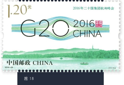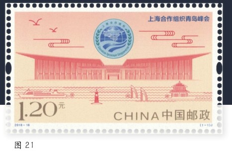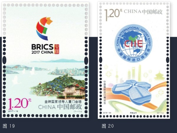 近年来,我国相继举办了APEC会议、G20杭州峰会、金砖国家领导人会议、上合组织会议及中国国际进口博览会等重大活动,这是我国重要的主场外交活动,对推动国际合作与和平发展具有重大意义。为配合这几次国际间的重大活动,中国邮政发行了《亚太经合组织第二十二次领导人非正式会议》、《2016年二十国集团杭州峰会》(图18)、《金砖国家领导人厦门会晤》(图19)、《中国国际进口博览会》(图20)、《上海合作组织青岛峰会》(图21)等邮票,为会议活动的举办营造了良好的氛围。为庆祝联合国成立70周年,我国发行了《联合国成立七十周年》纪念邮票一套2枚,从和平与发展两个维度营造良好的国际交流环境。2023年5月,我国和西班牙王国为纪念两国建交50周年发行了一套邮票,以增进中西人民之间的了解和友谊。