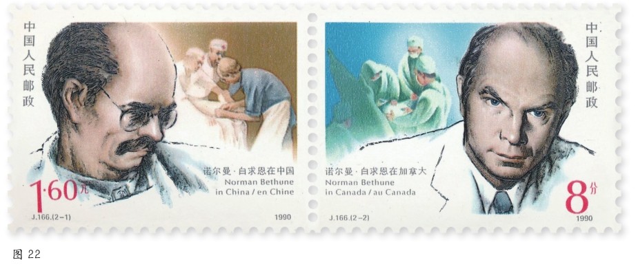 《诺尔曼·白求恩诞生一百周年》邮票(J.166)是中外联合发行的第一套人物邮票(图22)。1986年,加拿大邮政公司致函我国邮电部,建议两国在1990年白求恩诞生100周年之际联合发行纪念邮票。我方欣然接受了加方的建议。中加两国联合发行的这套邮票共2枚,采用连票形式,分别选用白求恩在中国和加拿大的肖像为主图,邮票上印有中、英、法三种文字。