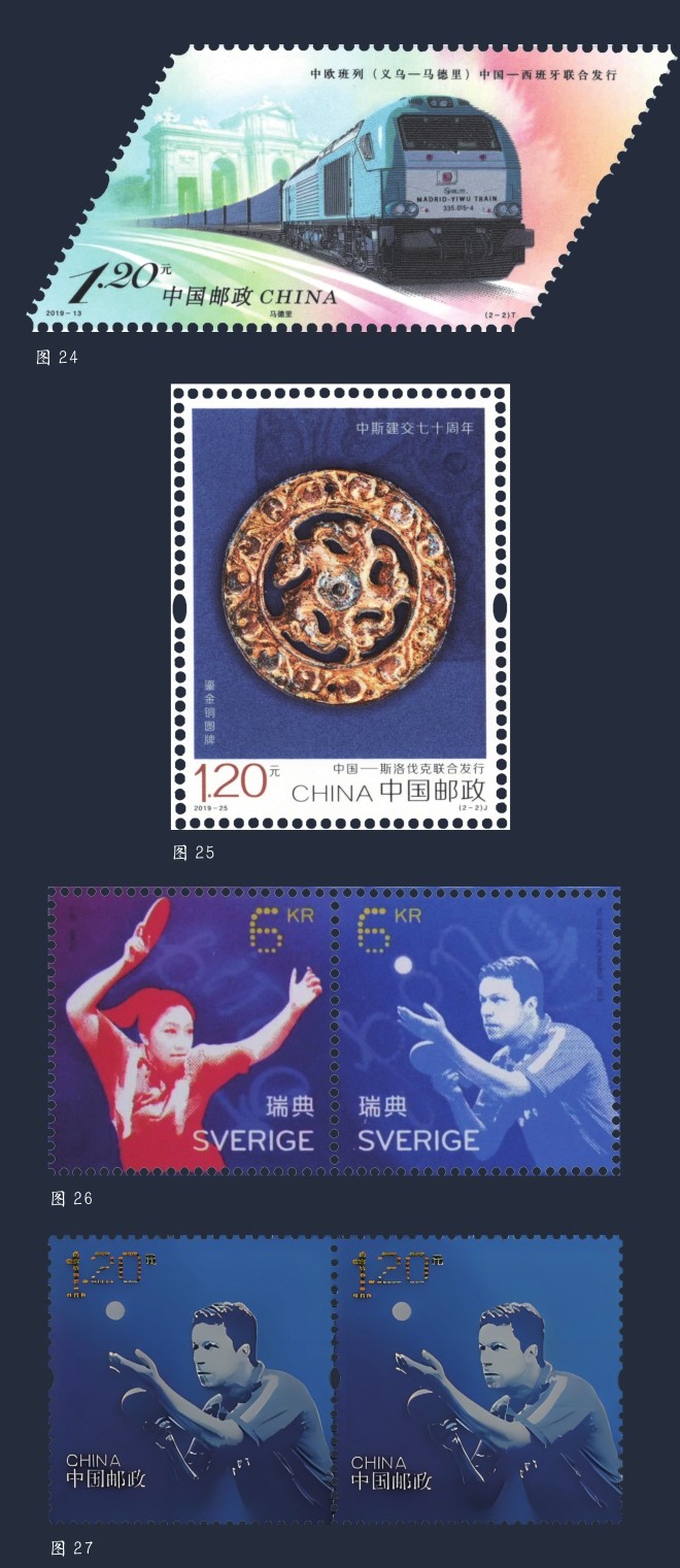 截至目前,我国共与五大洲的43个国家联合发行邮票52套。这些邮票选题内容丰富,涵盖了建交纪念、国际友人、历史建筑、风光文物、动植物、文化典籍、体育运动及天文仪器等诸多方面的内容。联合邮票的发行,不仅能更好地宣传各国的历史文化,而且增进了不同地区和民族人民之间的感情,有力地促进了双方的交流。仅在2019年,就有3套中外联合发行邮票面世,它们分别是我国与葡萄牙共和国联合发行的《中葡建交四十周年》(图23)、我国与西班牙王国联合发行的《中欧班列(义乌—马德里)》(图24)、我国与斯洛伐克共和国联合发行的《中斯建交七十周年》(图25)。