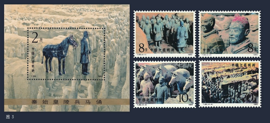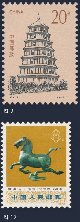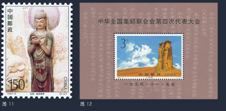走出敦煌,漫步在丝绸之路题材邮票的时空里,人们还可以欣赏到邮票《大雁塔》(图9)、《铜奔马》(图10)、《麦积山石窟》(图11)、《楼兰故城遗址》、《龟兹石窟壁画》等。为纪念1994年召开的中华全国集邮联合会第四次代表大会发行的小型张邮票(图12)也取材于丝绸之路,其图案为位于新疆的克孜尔尕哈烽燧。这座巍峨的建筑历经2000多年的风风雨雨,至今雄姿犹存,是丝绸之路上最古老、目前保存最完好的烽燧遗址。