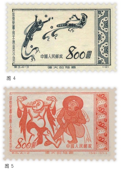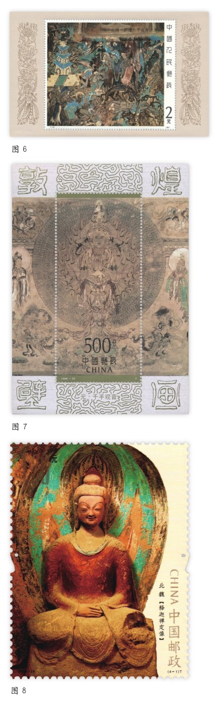 敦煌是古代陆上丝绸之路的重要节点城市,以莫高窟为代表的众多文化遗产记录了古代丝绸之路经贸繁荣、文明互鉴的盛景。中国邮政在1952年(图4《敦煌壁画·飞天》)、1953年(图5《敦煌壁画·伎乐人》)、1987年(图6《敦煌壁画·萨埵太子舍身饲虎》)、1996年(图7《敦煌壁画·千手观音》)和2020年(图8《莫高窟·释迦禅定像》)陆续发行了9套反映敦煌题材的邮票,这些邮票中的敦煌壁画集中反映了这一特点。