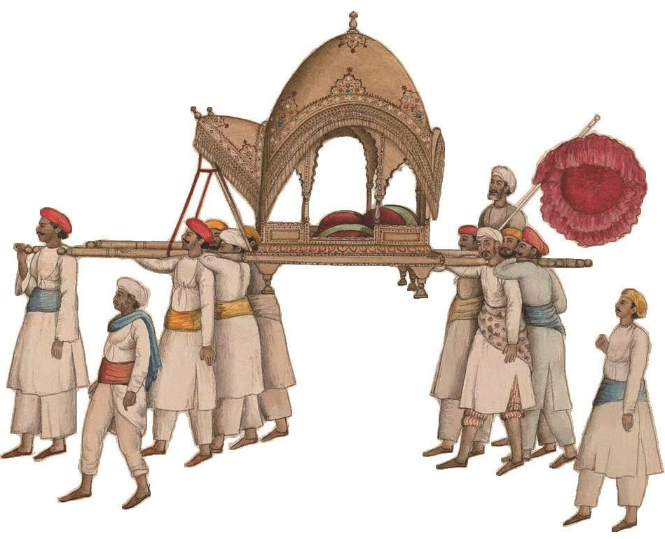 轿子在印度的历史也很悠久,印度史诗《罗摩衍那》和《摩诃婆罗多》中都多次提到轿子的使用。如《罗摩衍那》中有这样的诗句:“猴子们来到了以后,那太阳般的猴王说:‘猴子们呀!你们赶快把我那顶轿子准备妥!’猴子们听了他(它)的话,他(它)们行动都很迅速,他(它)们把轿子抬了来,轿子看上去悦人心目。”遗憾的是,这两部史诗中没有具体描述轿子的形制和样子。17世纪,西方人来到印度后,留下了不少与印度轿子相关的记录,并收集了一些印度轿子的图像。在英语中,印度轿子有其专有名词—palanquin。从图像上看,印度轿子由轿夫用肩膀扛着行进;可能是由于印度大陆气候炎热,轿子整体看起来像一个小亭子,顶部呈弧形,四面留空,便于通风。