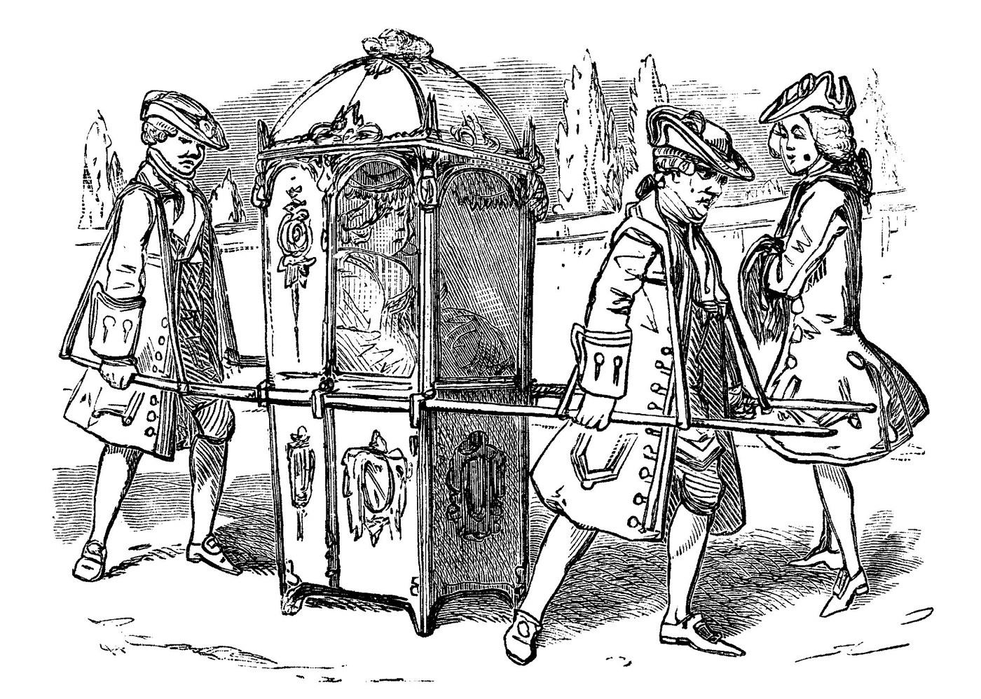 关于轿子在欧洲的旅行历程,当代历史学家特雷弗·福塞特的研究成果较为权威。他从英国史料出发,认为清晰地留下欧洲轿子早期影像的是英格兰旅行家菲尼斯·莫里森。1594年,莫里森在意大利那不勒斯和热亚那旅行时,曾饶有兴趣地记录了穿行在两座城市街头的轿子,这些晃动在轿夫肩头的新奇轿子被他称为“亚平宁半岛上最时尚的一幕”。1617年,这种时尚的交通工具就旅行到法国的巴黎和色当,当时轿子在法语中被称作chaises à porteurs,意为“人抬的椅子”。1634年,在英国伦敦也出现了轿子。
