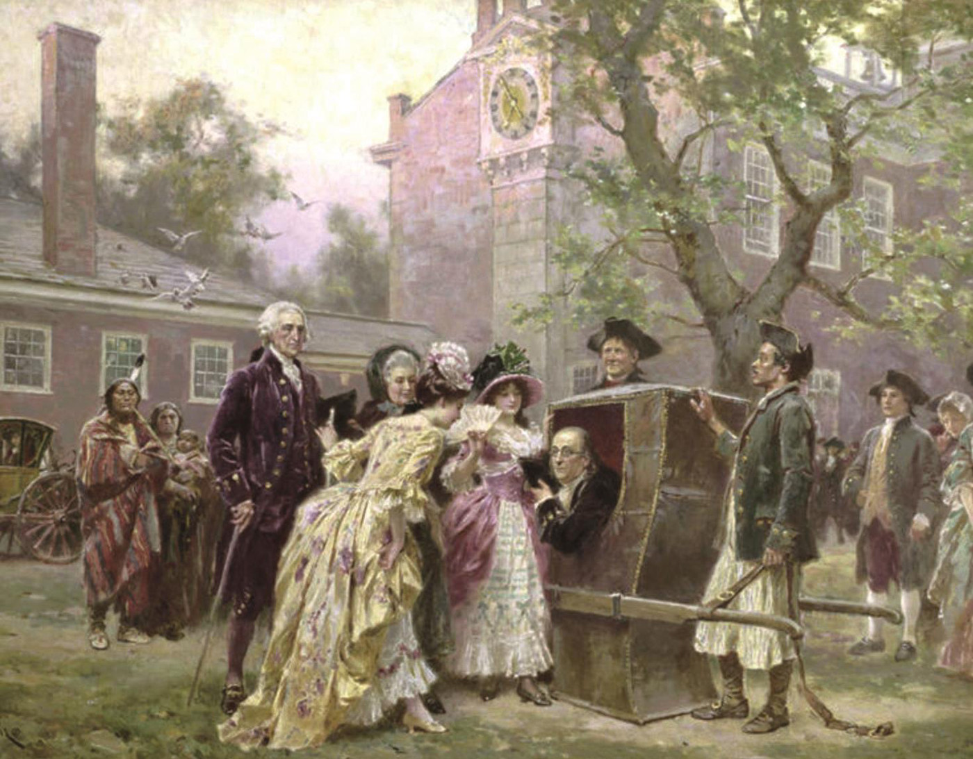 有了欧洲的示范,旅行到北美地区的轿子也颇受人们欢迎。18世纪,美国纽约、费城等地都有运营轿子的商业公司。美国著名的政治家、科学家本杰明·富兰克林(1706—1790年)就因年老体弱而从家中乘轿前往费城议会大厅。在珍藏于美国国会图书馆的油画《富兰克林的轿子》中,富兰克林从一顶停下的轿子中探出身来,正与三名女性和一名男性交谈,画面远处还有两名印第安女性。从画面上看,轿子通高一米有余,木制,与中国轿子十分相似;抬轿的两名轿夫则头戴军帽、身着军服。