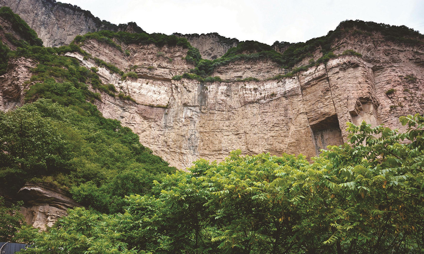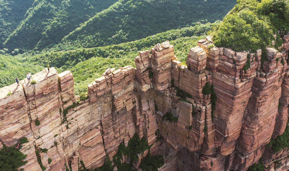 嶂石岩地貌最显著的特点表现为绵延数千米的岩墙峭壁。这些长墙由红色石英砂岩构成,其中最早的形成于18亿年前,质地坚硬且抗风化能力强,远远望去,如屏如画,甚为壮美,被誉为“一方绝胜”。而在有些地段,所谓的“百里赤壁、万丈红绫”并非只是一面连绵不断的直立陡崖,而是从下往上分成三段,形成了独具特色的阶梯状陡崖,人称“嶂石三叠”。从垂直剖面看,陡崖呈现出明显的阶梯状分布,每层高度均在百米以上,陡崖之间是坡度较缓的平台,堪称“天然栈道”,其上覆盖着郁郁葱葱的植被,与陡峭的崖壁形成鲜明对比。