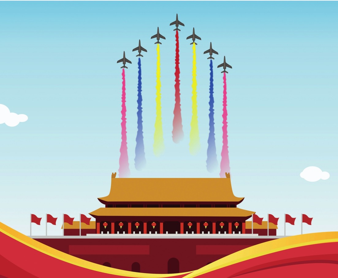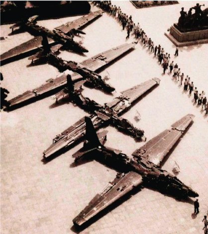 1949年10月1日的开国大典阅兵式上,人民空军17架战斗机飞过天安门上空,接受检阅。参加本次阅兵的17架飞机均为不久前从国民党军队手中缴获的,包括9架美制P-51“野马”战斗机、2架英制“蚊”式轻型轰炸机、3架美制C-46运输机、1架美制L-5联络机和2架美制PT-19教练机。为了让飞机看起来数量更多,领队的9架“野马”战斗机还在空域绕飞两圈后,进行了第二次通场。