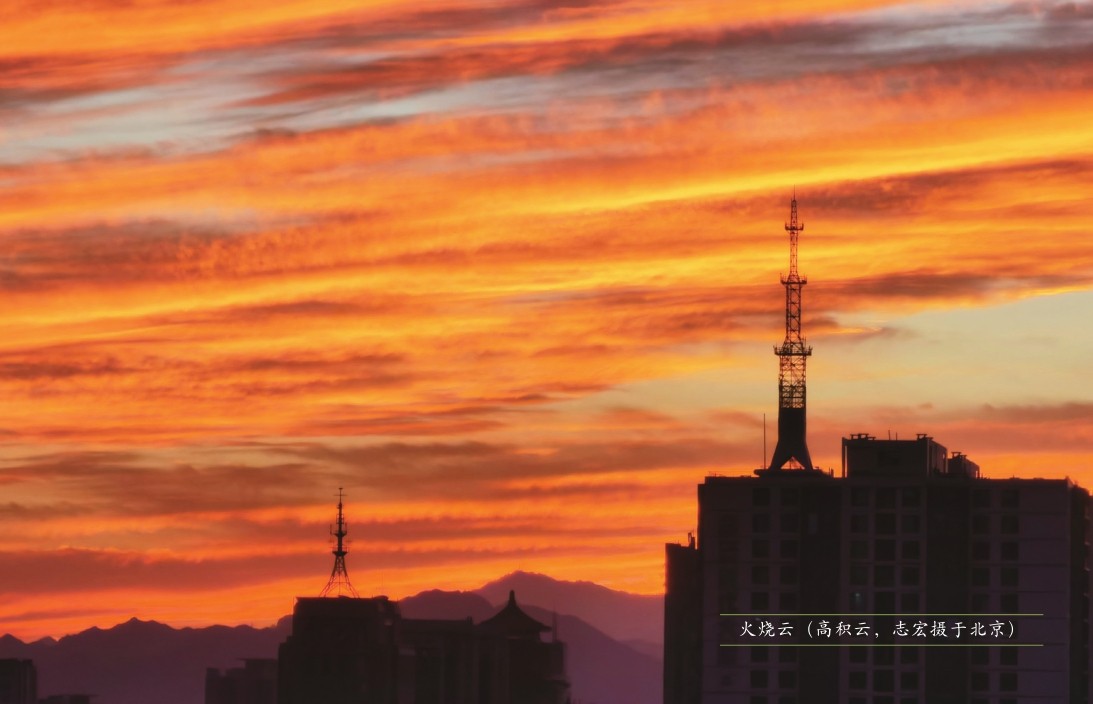 火烧云也常常被认为是“地震云”。火烧云因绚丽的色彩而引人注目,其色彩跟刚才提到的瑞利散射有关。傍晚,随着太阳高度角的逐渐降低,阳光在大气层中的路径越来越长,瑞利散射把可见光中波长较短的紫光、蓝光依次“截和”,最后只剩下波长最长的红光。因此,傍晚的火烧云起初往往是金黄色,尔后慢慢向红色过渡。从种类上看,高云族中的卷积云、卷层云,中云族中的高积云、高层云,低云族中的层云、层积云等都可以形成火烧云。也就是说,火烧云与地震根本风马牛不相及。