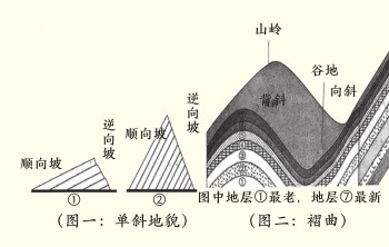 B项“据此可知图一中②所示为单面山”的表述张冠李戴,据材料一第五段可知,单面山的特征是山体沿岩层走向延伸,两坡不对称,一坡陡而短,另一坡缓而长,因而,图一中①所示应为单面山。
