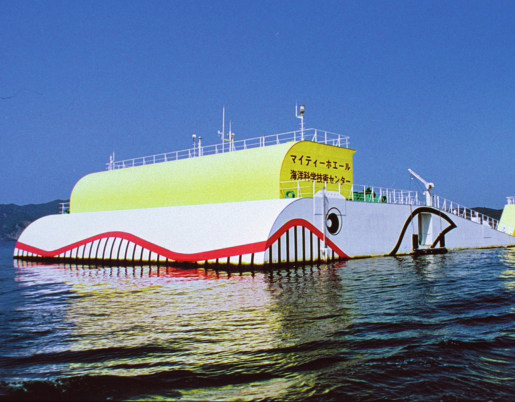 日本于1978年建成的“凯美(Kaimei)”是全球第一个部署在海洋中的大型漂浮式振荡水柱式波浪能发电装置,其年发电量可达190万千瓦时。继“凯美”之后,日本海洋科学技术中心于1998年研发出“巨鲸号”(图10)漂浮式振荡水柱式波浪能发电装置。“巨鲸号”内部设有多个空气室,利用振荡水柱(Oscillating Water Column,OWC)原理进行发电,共配备了3台波力发电装置,其中两台的额定功率为30千瓦,另外一台可根据波浪大小,转换为10千瓦和50千瓦的输出功率。丹麦的LeanCon也是一款漂浮式振荡水柱式波浪能发电装置,全尺度装置宽240米,包含8个透平和发电机组,装机容量为4.6千瓦。需要说明的是,以上三个装置均采用了垂直管技术。