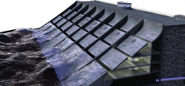 此类装置主要利用水的重力势能发电,其结构与大坝相似。波浪通过特殊的开口涌进高位蓄水池中,由于蓄水池中的水与自由水平面间存在高度差,推动涡轮机将水的势能转换为电能。鉴于越浪式波浪能发电装置的结构特点,人们常常把它们与防波堤结合起来,达到兼顾发电和抗击风浪的效果。