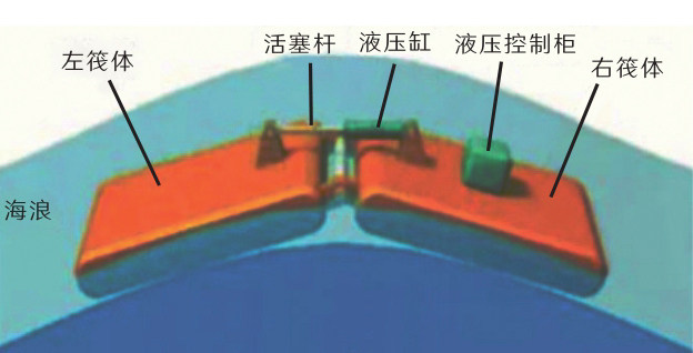 其发电原理是,“鸭体”绕支撑轴作往复回转运动,从而驱动连接“鸭体”与支撑轴之间的液压缸,将波浪能转换为电能。该发电装置在规则波下表现良好,但美国麻省理工学院(MIT)的研究人员早在1980年便发现,点头鸭式波浪能发电装置在随机波下的表现较差。