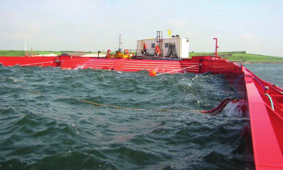 目前,比较典型的筏式装置有英国的“海蛇号(Pelamis)”。该装置已进入商业化运营阶段。其主体部分由4个圆柱形的不锈钢浮筒和3个动力关节铰接而成,全长120米,重达750吨,额定设计功率是750千瓦。在“海蛇号”的动力关节内部有两个液压缸,一旦不锈钢浮筒随波浪起伏,浮筒和动力关节之间便会发生相对运动,推动液压缸内的活塞往复运动,从而驱使内部的发电机发电,产生的电能则通过海底电缆传输到岸上。