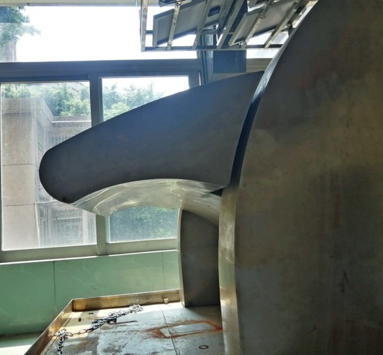振荡水柱式是最早出现的一类波浪能发电装置,其发展历史可追溯到1910年法国建立的波浪能发电装置。自1973年以后,此类装置成为研究热点,尤其在日本及欧美等国家。该装置主要由气室和空气透平组成,装置里的空气会随着波浪的起伏反复进行活塞运动,从而使得空气不断从气室上的气孔(气嘴)流出,只要在气嘴上装个空气透平就可以将波浪能转为电能。空气透平其实就是一个逆向运行的风扇,让波浪推动空气变成电(图8)。该类波浪能发电装置的一级转换效率较高,并且具有施工成本低、稳定性好等优点,发展前景良好。