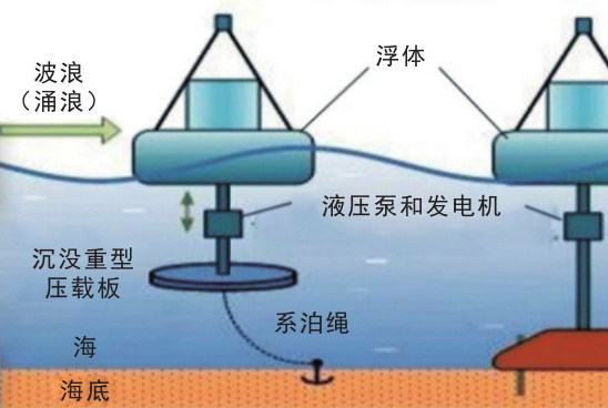 振荡浮子式波浪能发电装置主要利用浮子与浮子(固定式的浮子被称为定子)之间的相对位移发电。其装置复杂多样,主要包括以下几种。