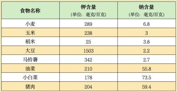 上述常见食物中的钾含量都比钠含量多。在粮食作物中,钾含量尤其丰富而钠含量极少;在茎叶类食物和动物性食物中,钾钠含量比仅略低于健康人体中的钾钠含量比(健康人体中,钾钠含量比约为3:1)。通常,人体每日所需钾为2~4克,所需钠为4~6克。合理饮食的情况下,人体所需的钾完全可以从食物中获取,因而不需要额外补充;但食物中的钠含量较低,所以人们必须要额外摄入钠,才能满足人体所需。